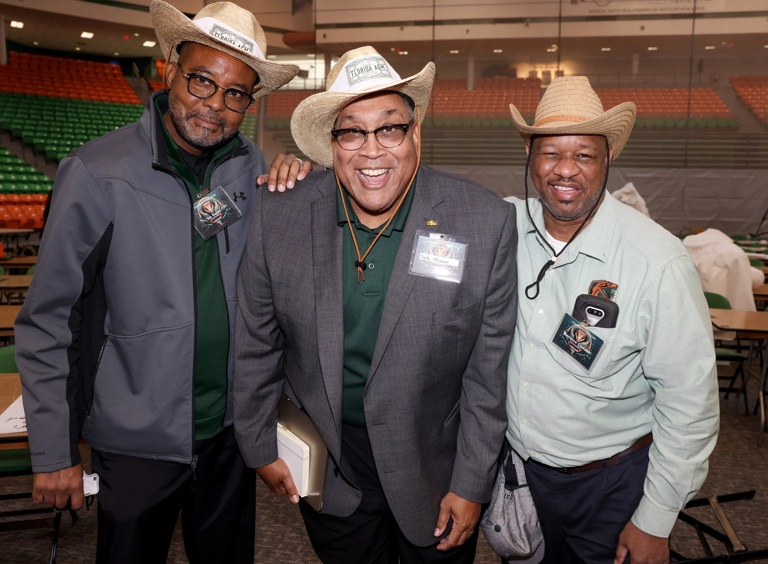 Florida A&M’s 12th President Dr. Larry Robinson has some fun with members at the 2023 FAMU Royal court after the Royal luncheon.